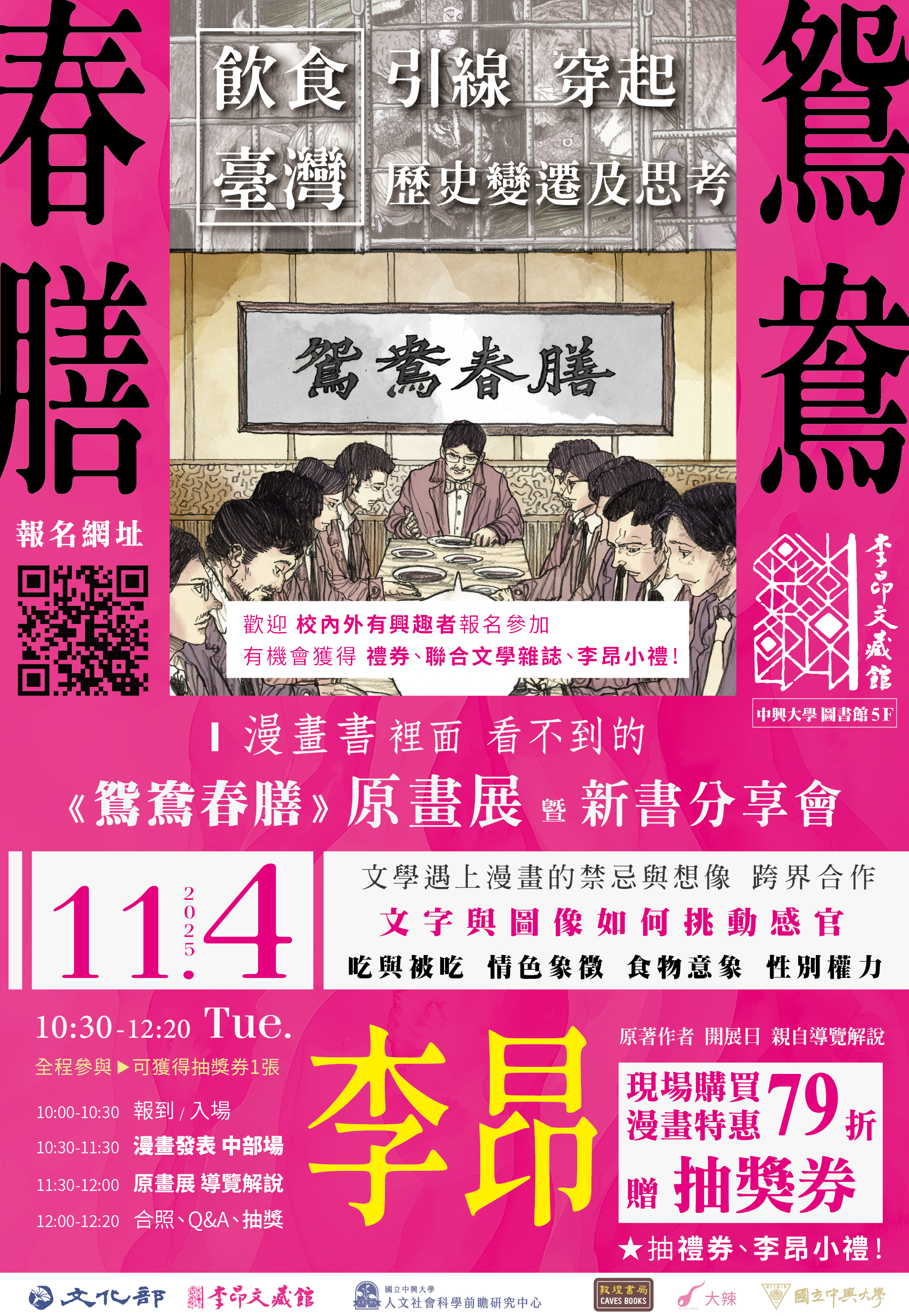 文化部獎勵 中興大學  114年  「臺灣歷史的食譜:李昂《鴛鴦春膳》改編漫畫及跨域行銷推廣計畫」,由作家李昂 創作小說《鴛鴦春膳》(已授權法文版)為本,跨界合作香港漫畫作者柳廣成,即將以漫畫形式重新詮釋,將故事中飽滿的情色象徵、食物意象與對於性別、權力的深刻探討,以視覺藝術語言完美呈現。
